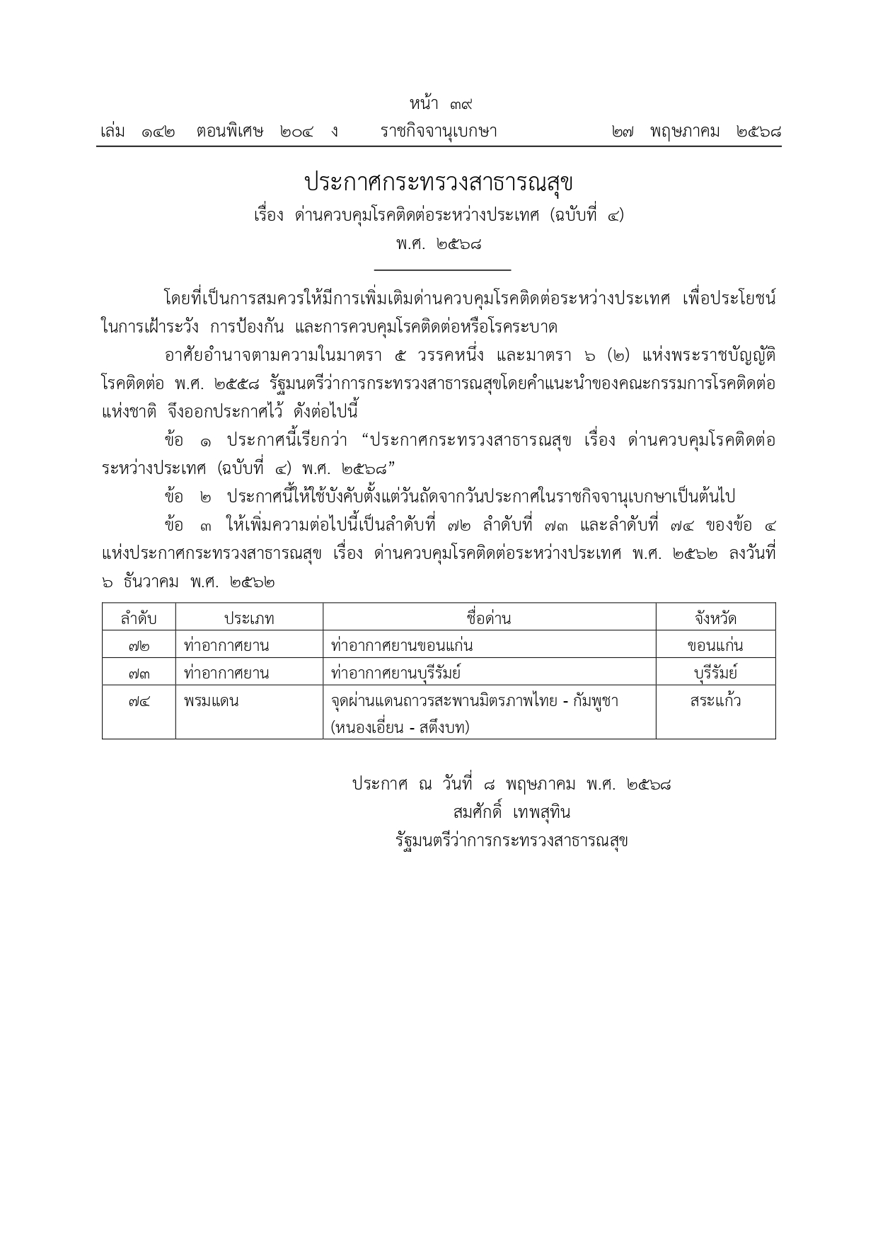 จังหวัดอุบลราชธานี ได้รับแจ้งจากกรมส่งเสริมการปกครองท้องถิ่นว่า กรมควบคุมโรค ได้มีการจัดทำอนุบัญญัติที่ออกตามความในพระระราชบัญญัติโรคติดต่อ พ.ศ. ๒๕๕๕๘ จำนวน ๒ ฉบับ ได้แก่ ประกาศกระทรวงสาธารณสุข เรื่อง ด่านควบคุมโรคติดต่อระหว่างประเทศ (ฉบับที่ ๔) พ.ศ. ๒๕๖๘ และ ประกาศคณะกรรมการโรคติดต่อแห่งชาติ